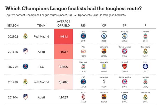 与过去历届欧冠征程相比,这条通往荣耀之路究竟有多轻松?为了回答这个问题,The Athletic借助ClubElo评分来衡量历年来欧冠球队的实力。ClubElo是由Lars Schiefler设计并维护的一套排名系统,基于与国际象棋排名相同的方法论。球队击败的对手越强,获得的积分就越多;击败的对手越弱,获得的积分就越少。简而言之,评分越高,代表球队实力越强。